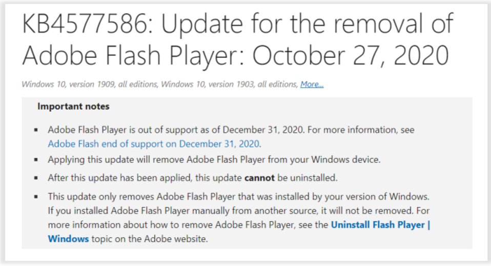 1. ΢ÈíÕë¶ÔWindows10ÒÑÌṩ²¹¶¡×Ô¶¯É¾³ýFlash Player£¬£¬£¬£¬£¬£¬£¬£¬×°Öò¹¶¡KB4577586¼´¿É;